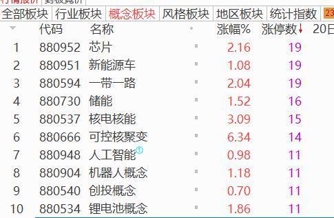 概念板块方面,芯片、新能源车、“一带一路”等板块位居涨停前三名,分别录得19只个股涨停。
