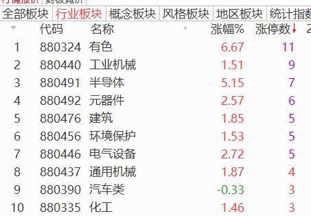 板块题材方面,有色金属、工业机械、半导体、元器件等涨幅居前,其中有色全线大爆发,录得涨停板11个。