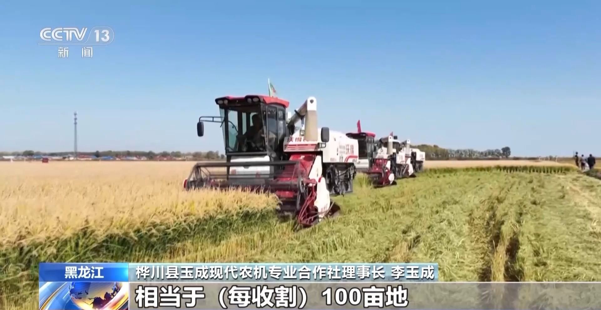 在黑龙江桦川县这片12000亩的稻田里,大型联合收割机正开足马力工作。这两台收割机升级了脱粒滚筒、清选系统等核心部件,将收获率提高到95%。